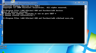 Setelah itu ketikan Program adb sideload user.zip kemudian klik enter tunggu hingga proses instal sampai 100% seperti gambar di bawah